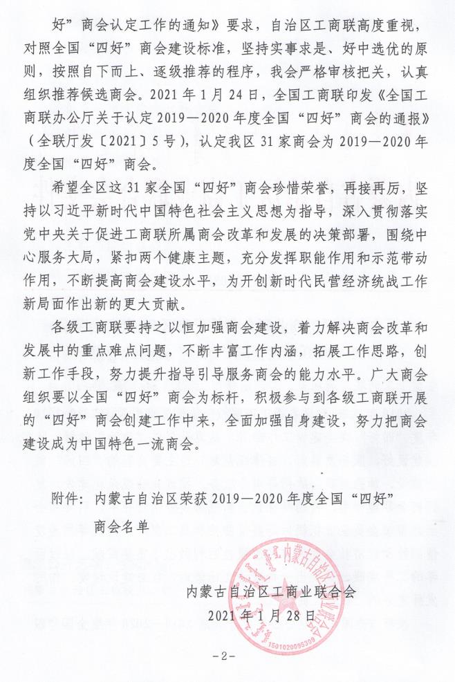 工商聯(lián)所屬商會是做好民營經(jīng)濟(jì)統(tǒng)戰(zhàn)工作的重要組織依托。為深入推進(jìn)工商聯(lián)所屬商會改革發(fā)展,持續(xù)深化“四好”商會建設(shè),全國工商聯(lián)組織開展了20192020年度全國“四好”商會認(rèn)定工作,經(jīng)過嚴(yán)格的推薦、初審以及專家評審組評審等環(huán)節(jié),日前認(rèn)定了1478家全國“四好”商會。內(nèi)蒙古農(nóng)牧業(yè)產(chǎn)業(yè)化龍頭企業(yè)協(xié)會榮獲全國“四好”商會榮譽(yù)稱號。