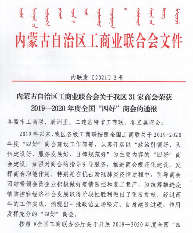 標(biāo)題:喜報(bào)!內(nèi)蒙古農(nóng)牧業(yè)產(chǎn)業(yè)化龍頭企業(yè)協(xié)會榮獲全國“四好”商會榮譽(yù)稱號