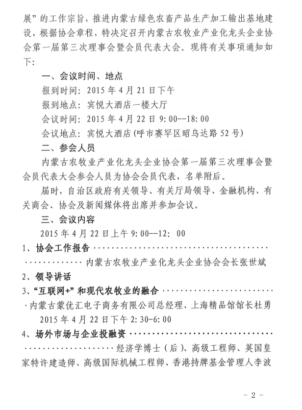 關(guān)于召開內(nèi)蒙古農(nóng)牧業(yè)產(chǎn)業(yè)化龍頭企業(yè)協(xié)會第一屆第三次理事會暨會員代表大會的通知